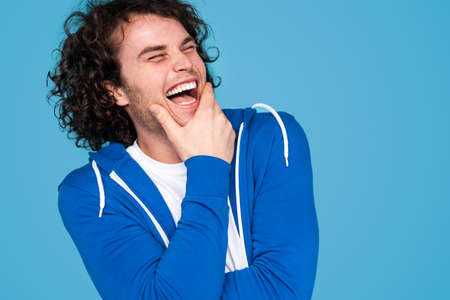 European young man is laughing loudly. studio shot