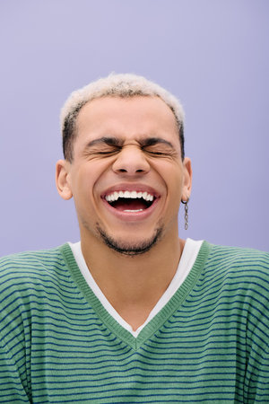 A joyful young Black man laughs in a stylish outfit, surrounded by purple.