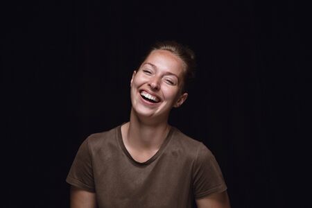 Close up portrait of young woman isolated on black studio background. Photoshot of real emotions of female model. Smiling, feeling crazy happy, laughting. Facial expression, human emotions concept.