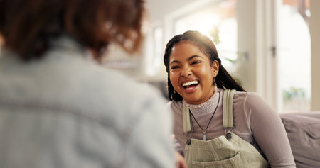 Bonding, funny and woman friends on sofa in living room of home together for reunion or visit. Conversation, laughing and relax with people in apartment for gossip, relationship or social on weekend