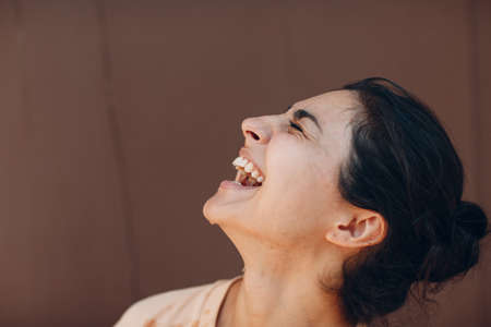 Portrait of beautiful Indian american joyful optimistic positive woman laughing profile view