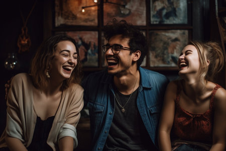 Group of joyful friends laughing and enjoying a conversation indoors.