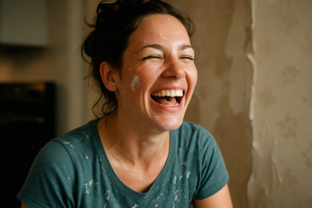 Cheerful woman laughing and covered in glue while joyfully renovating her home, embracing the fun and mess of DIY projects