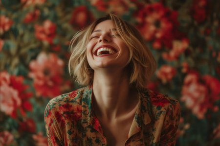 Portrait of a cheerful young woman with blond hair laughing with closed eyes on a floral background