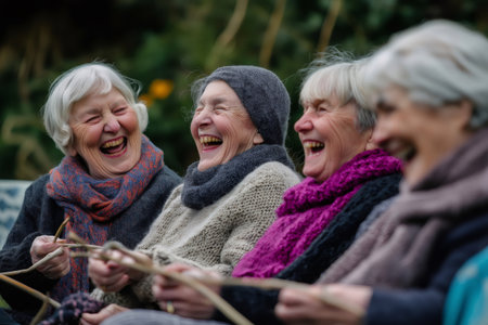 Four elderly women sitting together outdoors, knitting and sharing laughter, embodying joy and friendship in a warm, sunny park setting