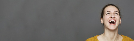 glowing happiness concept - beautiful 20s girl bursting out laughing for wellbeing and serenity,studio shot on gray background, long banner