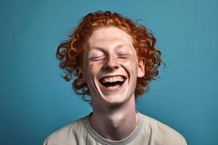 Radiant Joy Unleashes Genuine Laughter in a Bright Blue Studio Space, Creating Authentic Happiness