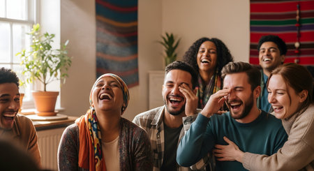 A diverse group of young friends laughs hysterically together while sitting indoors, enjoying a fun social gathering. The image captures genuine joy, friendship, and the happiness of shared moments.