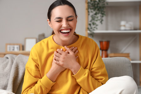 A woman is laughing in an indoor setting. She is wearing glasses and a sweater, with her face illuminated by daylight. The composition includes soft textures and warm colors, suggesting a comfortable environment. This image could be used for various commercial and editorial projects.