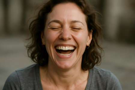 Portrait of a cheerful woman with closed eyes and open mouth, expressing pure joy and happiness