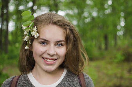 Beautiful happy girl in the spring in the fresh air in a good mood