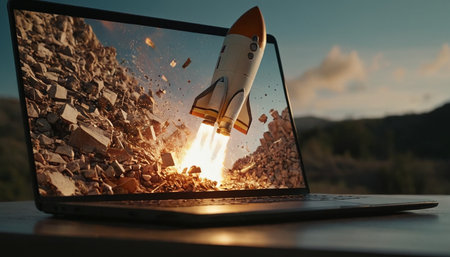 A rocket ship emerges from a laptop