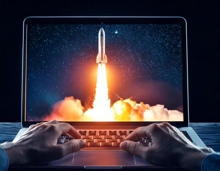 Launching a space rocket from a laptop screen.
