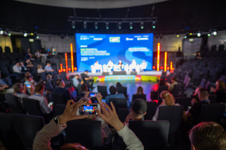 Blurry audience members with focus on smartphones capturing lively panel discussion on main stage.