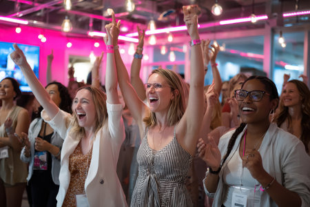 A group of women cheer and raise their arms in excitement during a lively gathering in a modern space.