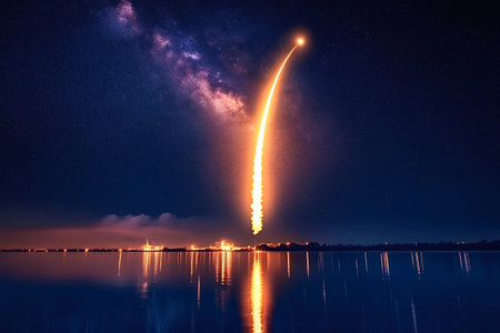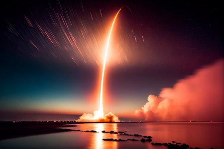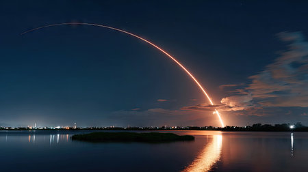 A rocket launches at night, leaving a bright trail in the sky. The calm waters reflect the vibrant light, creating a stunning scene of technology and nature.