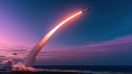 Vibrant ballistic missile launch with fiery engines blazing casting a dramatic plume of smoke in the dusky sky