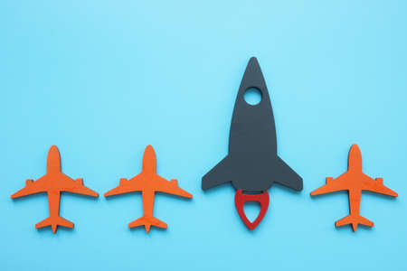 Competitive advantage concept. Figures of planes and a large rocket.