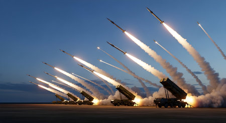 A dramatic sky scene of a rocket artillery attack with missiles and heavy weaponry in a conflict zone, echoing global tension and modern warfare.