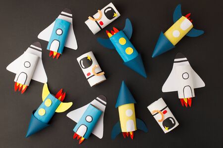 School kindergarten crafts, paper spaceship, shuttle, astronaut on black background with copy space for text. Party concept handcraft, diy, creative idea from toilet tube, recycle