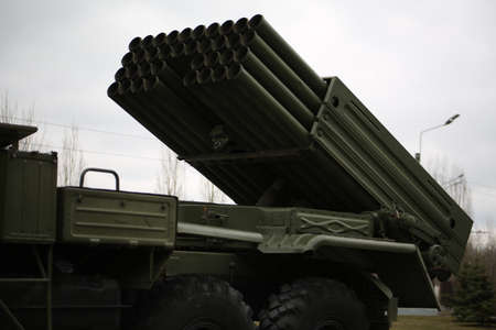 Kyiv, Ukraine – October 9, 2019: Military equipment (Multiple Launch Rocket System) during International Specialized Exhibition ARMS AND SECURITY 2019.