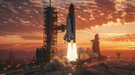 Space Shuttle Launch at Twilight, Rocket Ignition and Smoke Against Sunset Sky