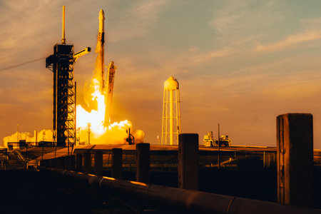 Generative AI : SpaceX rocket Falcon 9 rocket capsule soars upward after lifting off from launch pad Digitally enhanced Elements of this image furnished by NASA