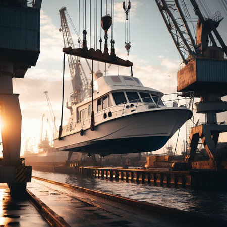 The dock comes alive at dusk with a vibrant mix of shipping containers and illuminated cranes working against a twilight backdrop. Generative AI.