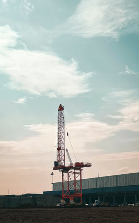 This captivating aerial shot captures a vibrant orange construction crane overlooking calm blue water, complemented by industrial vessels and intricate shoreline patterns.