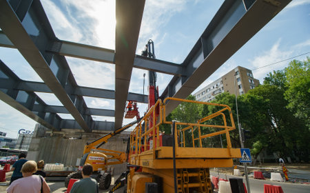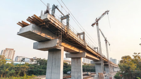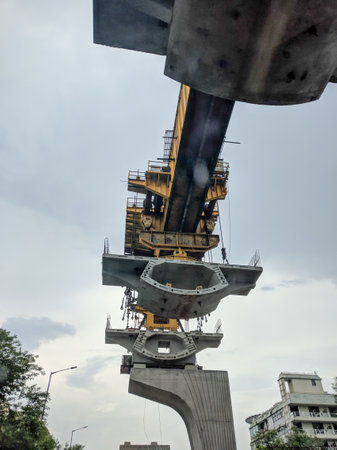 zoomed shot of bridge building machine making an overpass bypass elevated road to ease congested traffic in Indian cities like Gurgaon