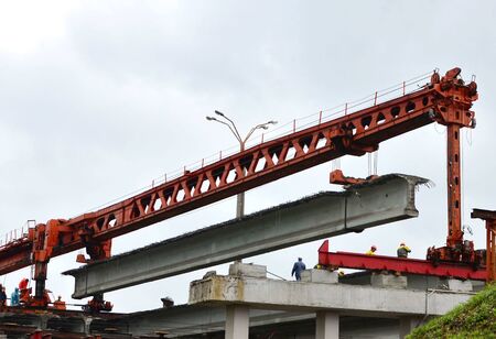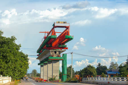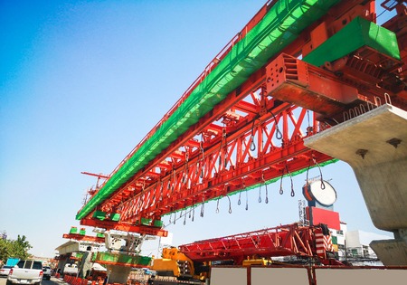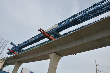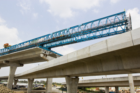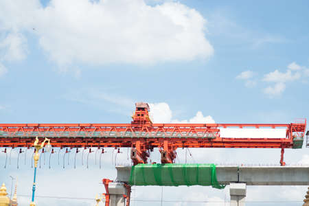 Launching gantry structure for installing concrete typical segment joint on foundation of Elevated Expressway in road construction site against blue sky background