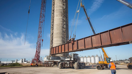 A construction site featuring heavy machinery in action, showcasing a crane lifting a large metal beam next to an industrial tower under a clear blue sky.