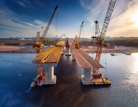 A dramatic shot of a bridge under construction over a river, with cranes and workers visible, showcasing the development and progress of infrastructure projects.