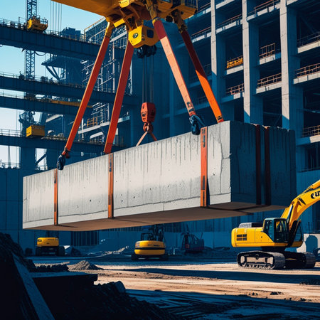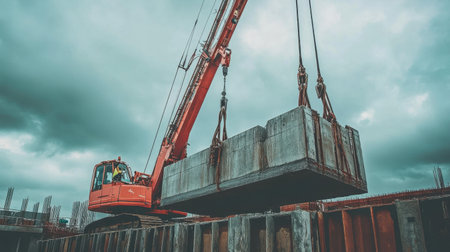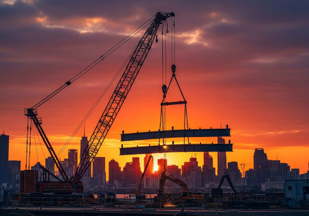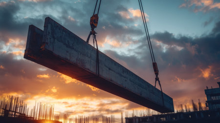 A towering crane hoists a large concrete beam against a vibrant sunset backdrop. Silhouetted construction site structures add depth, capturing the essence of urban development.