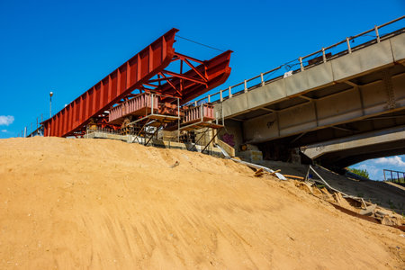 Repair of the automobile bridge over the railway. Mounting crane removes reinforced concrete beams. Bridge girder erection machine. Bridge construction, Minsk, Belarus
