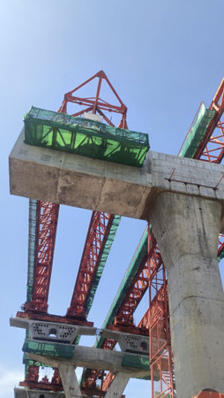 Concrete bridge pier and red steel gantry construction with green safety netting against blue sky, dynamic industrial scene