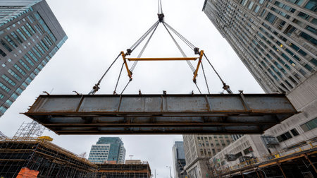 A heavy steel beam is being lifted by a crane at an urban construction site surrounded by tall buildings under a gray sky. The scene emphasizes construction and engineering.