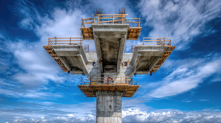 A striking image showcasing the construction of a modern bridge tower, featuring a robust concrete structure, scaffolding, and a backdrop of vibrant blue skies and clouds, capturing the essence of engineering and development.