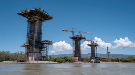 Heavy machinery works diligently to erect a massive bridge structure spanning the river.