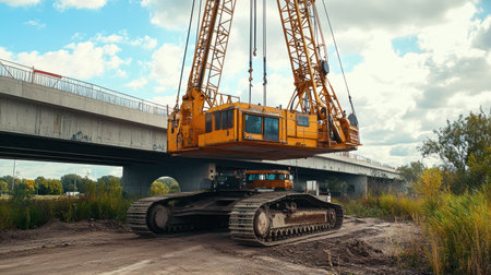 Close-up of a heavy-duty crane lifting equipment during the construction of a bridge, showcasing industrial engineering and infrastructure development.