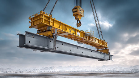 Heavy crane lifting steel beams at construction site during sunset with clouds in the background showcasing industrial machinery and urban development