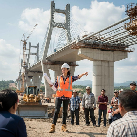 A group of construction workers in hard hats standing underneath a large bridge, discussing work plans.