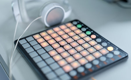 Beat maker programming rhythms using a MIDI drum pad and laptop in a compact home studio environment,