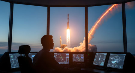 A person sits in a high-tech control room, silhouetted against a large window showing a powerful rocket launching into the twilight sky. Multiple computer screens with complex data are visible on the console. The scene captures the excitement and precision of a space mission launch.