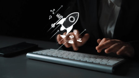 Rocket launching from smartphone in creative digital artwork at home office setting