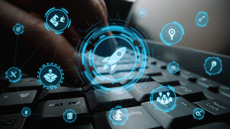 Laptop screen displays a vibrant blue backdrop with a rocket launching. Concept Space Exploration, Technology, Innovation, Futuristic Concepts
