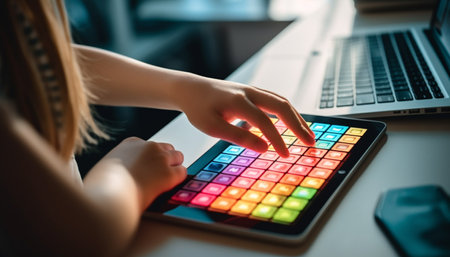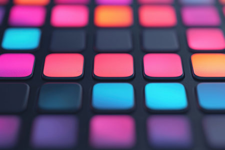 A close-up view of a high-tech control surface where vibrant, glowing buttons in a rainbow of colors await a users touch. This image evokes a sense of creativity, innovation, and control, perfect for concepts related to music production, gaming, or futuristic user interfaces.