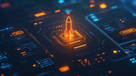Dynamic visualization of a futuristic rocket in a digital setting, featuring bright glowing elements that symbolize innovation and technological advancement in space exploration.
