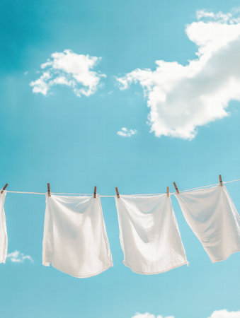 Freshly washed white clothes hang on a line, gently swaying in a warm breeze beneath a clear blue sky, perfect for adding text.