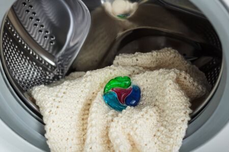 Capsule for washing in the drum of a washing machine with a woolen knitted blanket. Close-up shot.